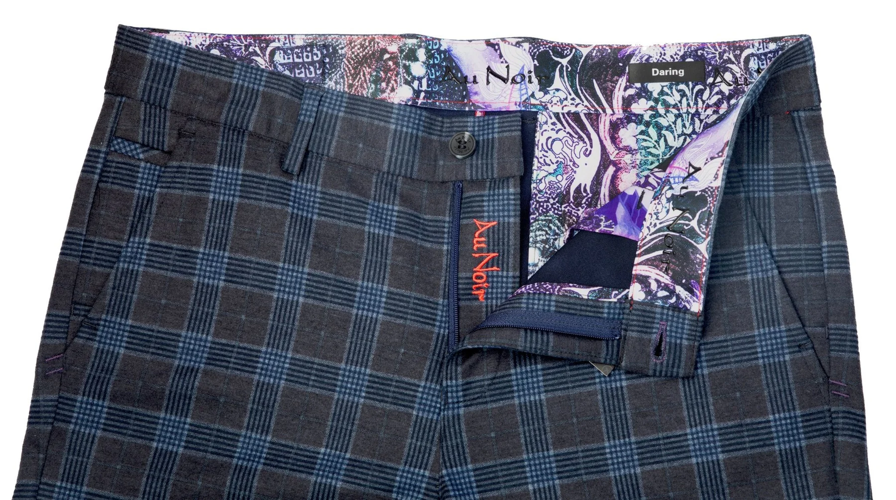 Au Noir pants were built and designed with attention to every detail, very much like all the products they make, while always putting fit, integrity and comfort first.?ÿNot forgetting the signatures and colorful fun finishes that have made them famous. You will notice the buttonhole on an angle like?ÿAu Noir shirts. The buttons are the same special octagon shape.?ÿThe pocketing, inner lining and interior finishes are designed with some of the specialty garnishes as used in their shirts and blazers.?ÿ
